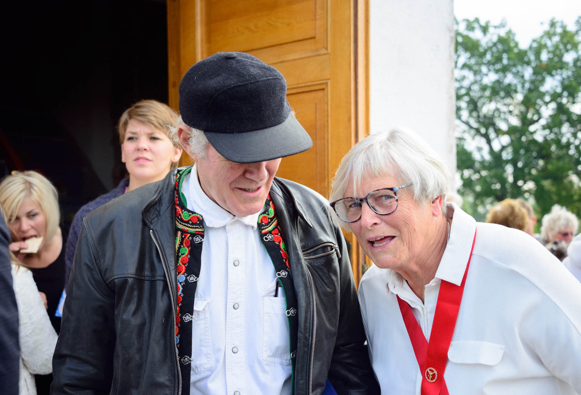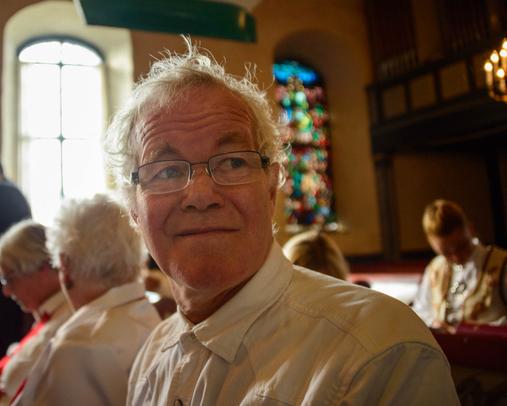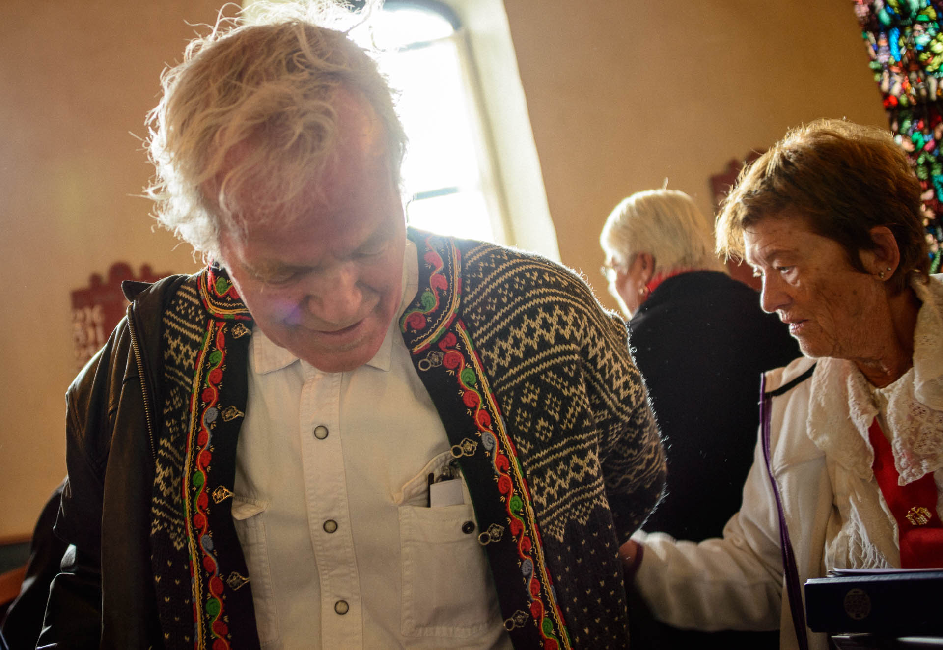 Endelig en kor-økt! Sidemannen sier ja til å ta et par bilder. Pappa gjemmer seg bak en vakker eldre dame med briller, og prøver stadig å avslutte og begynne å gå ned fra podiet.